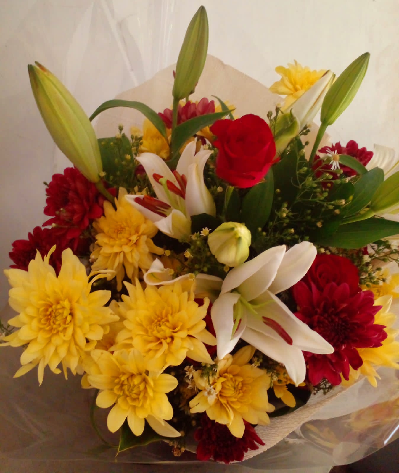 A joyful celebration of color, fragrance, and beauty. Bloom Medley Bunch brings together the cheerful charm of chrysanthemums, the elegant flair of lilies, and the timeless romance of roses—hand-tied into a gorgeous, fresh bunch. Perfect for birthdays, congratulations, or brightening someone’s day, this bouquet is a versatile and heartwarming gift for any occasion.