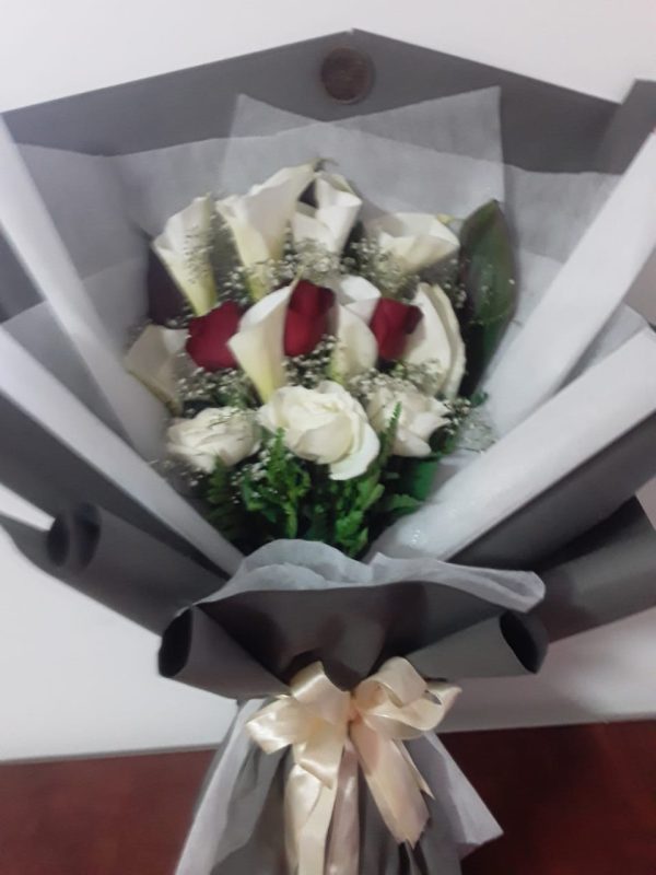 A graceful sheaf that blends purity and passion in one heartfelt gesture. Serene Affection features the classic elegance of roses intertwined with the sculptural beauty of arum lilies, creating a striking yet soothing floral display. Thoughtfully arranged in a sleek sheaf style, this bouquet is ideal for expressing sympathy, admiration, or unconditional love with timeless sophistication.