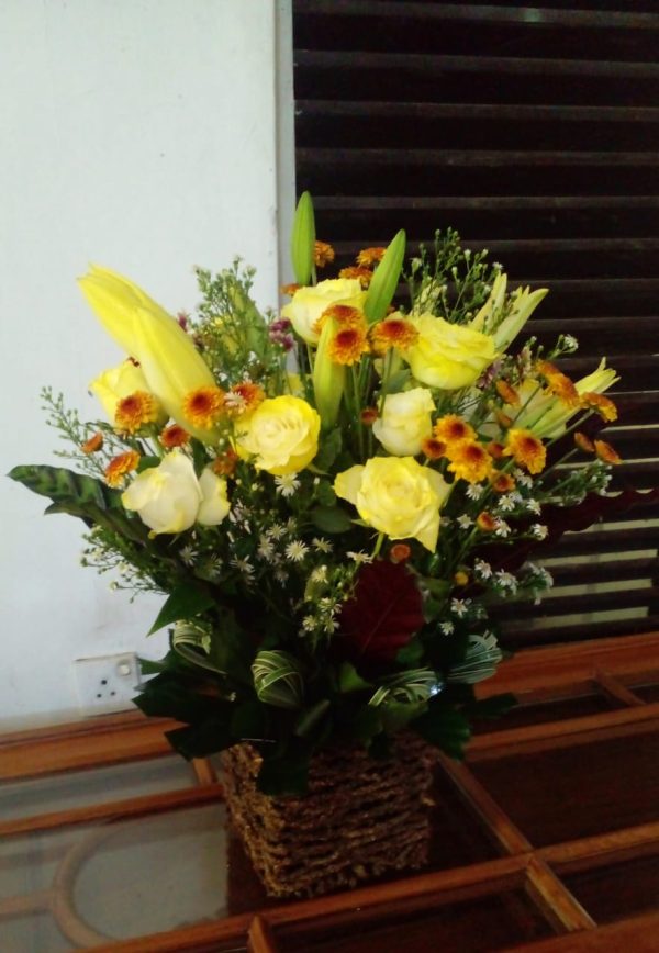 A radiant centerpiece that brings warmth and elegance to any table. Sunlit Grace features 12 vibrant yellow roses and 6 graceful lily stems, beautifully arranged to create a low, stylish display perfect for dining tables, receptions, or heartfelt gifting. Bursting with positivity and charm, this arrangement lights up any room with its cheerful presence.